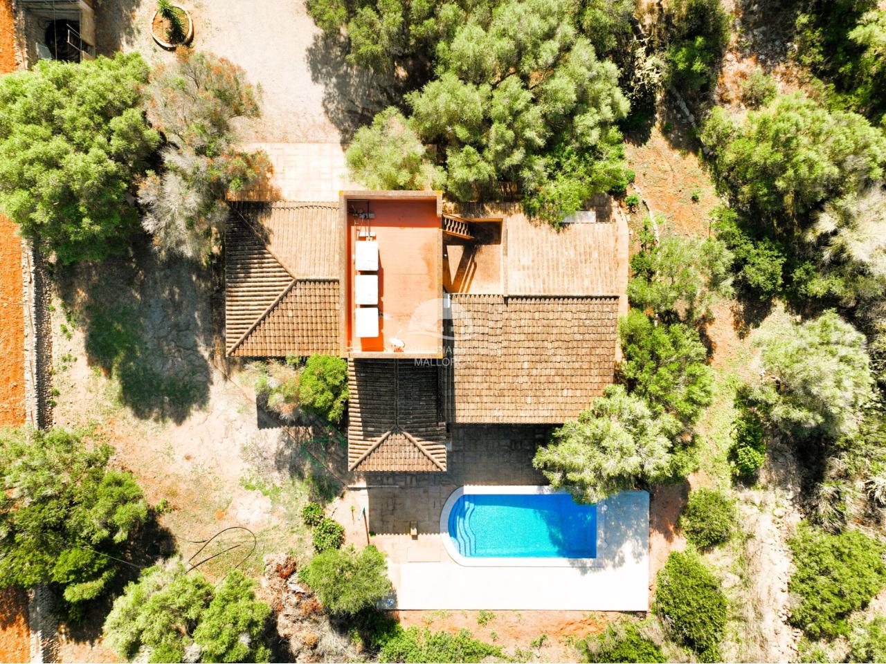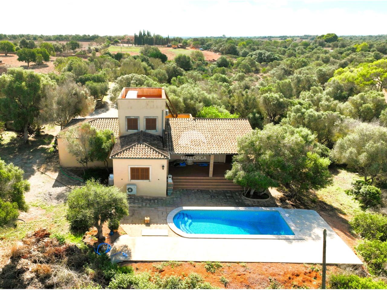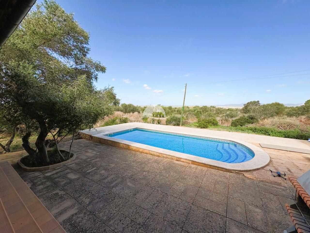 La propiedad tiene una superficie construida de 247m2 construidos sobre una parcela de 14.000m2 que está completamente vallada y que tiene zonas con matorrales y plantación de ullastre. Hay una vivienda con dos niveles, un garaje con dos plazas adjunto y una piscina con terraza y vistas al campo y a los alrededores.
