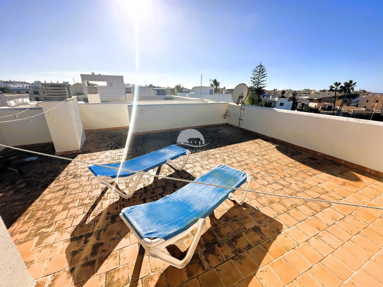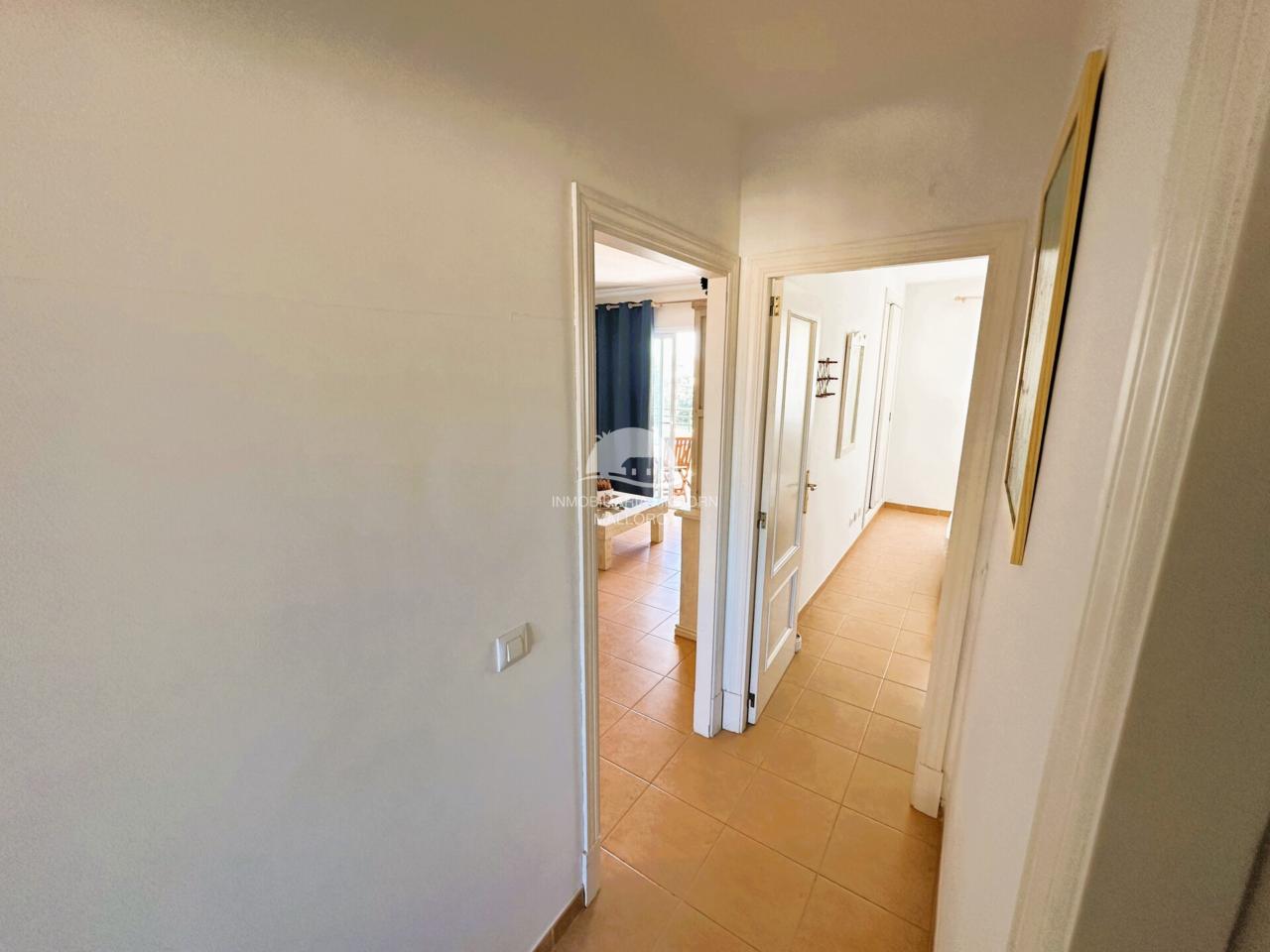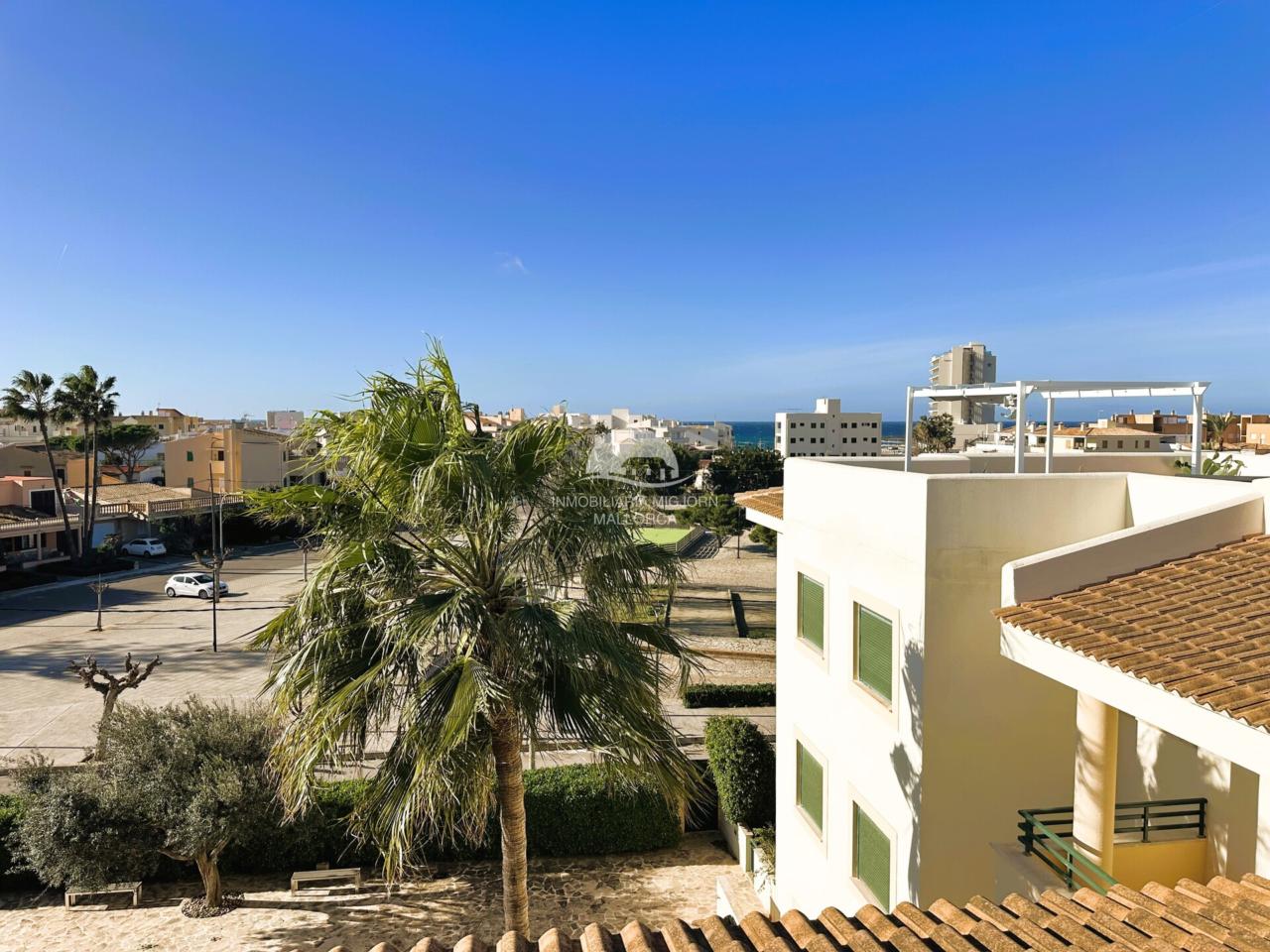 La vivienda de 79m2 cuenta con un amplio balcón-terraza delantero y una terraza solárium de 50m2 en la azotea con acceso y uso particular. La vivienda dispone de 2 habitaciones dobles con armarios empotrados, dos baños (uno de los cuales en suite), una amplia sala de estar-comedor con acceso a la terraza cubierta con vistas despejadas y una cocina separada con lavadero en el balcón trasero. Hay vistas parciales al mar, al jardín con piscina y a la plaza tanto desde el balcón como desde la azotea.