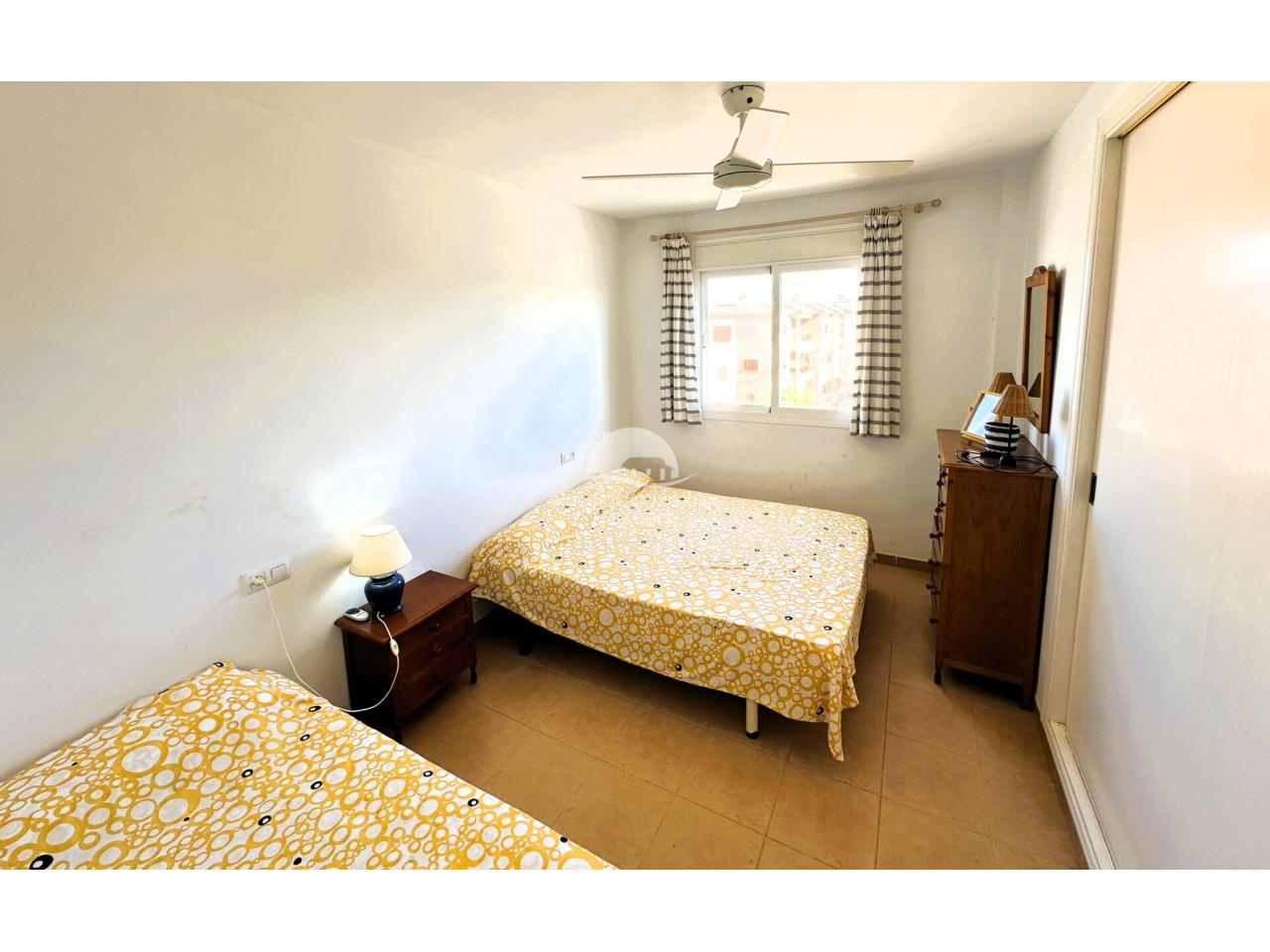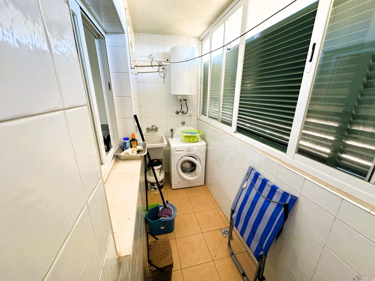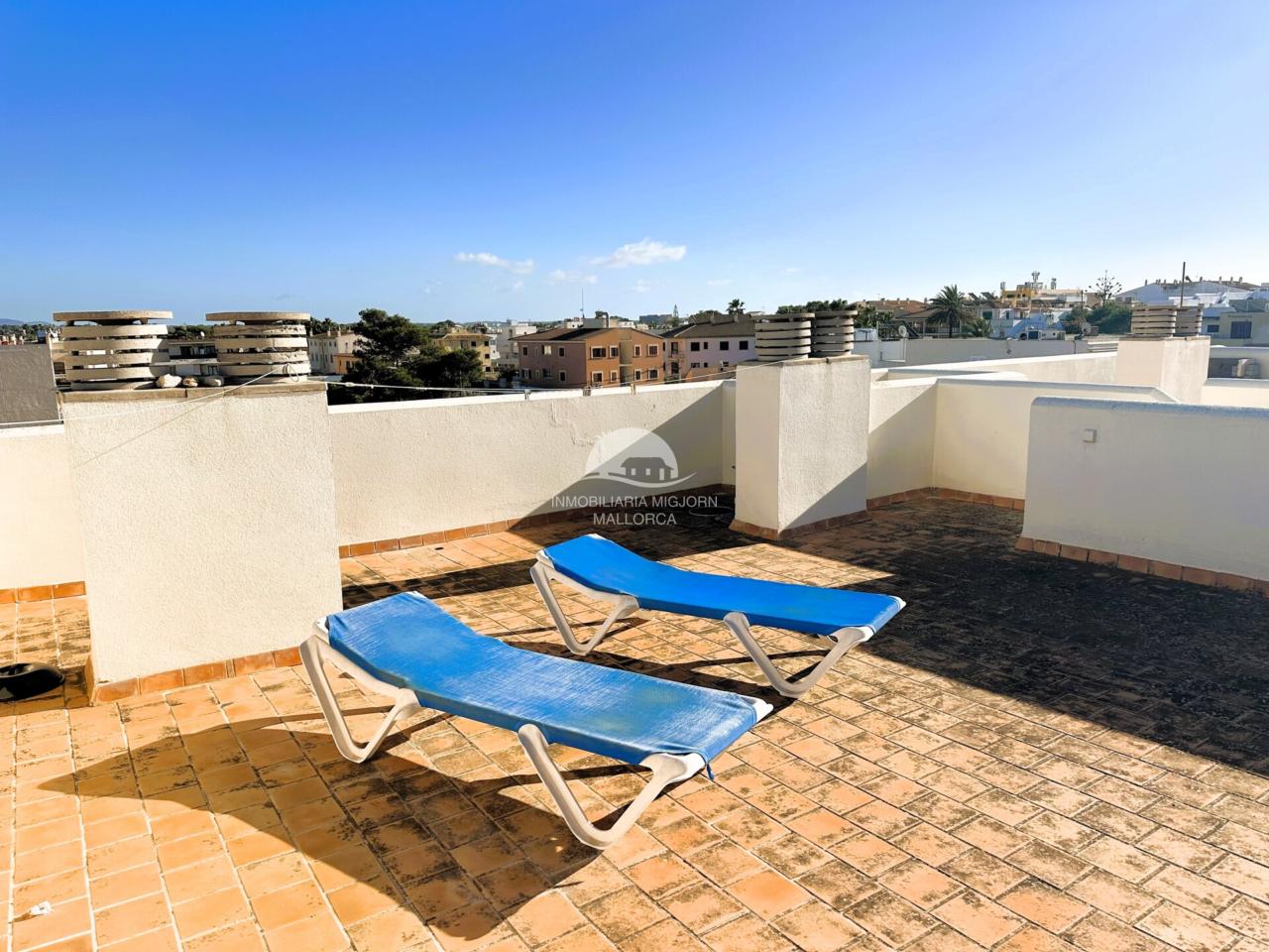 La vivienda de 79m2 cuenta con un amplio balcón-terraza delantero y una terraza solárium de 50m2 en la azotea con acceso y uso particular. La vivienda dispone de 2 habitaciones dobles con armarios empotrados, dos baños (uno de los cuales en suite), una amplia sala de estar-comedor con acceso a la terraza cubierta con vistas despejadas y una cocina separada con lavadero en el balcón trasero. Hay vistas parciales al mar, al jardín con piscina y a la plaza tanto desde el balcón como desde la azotea.