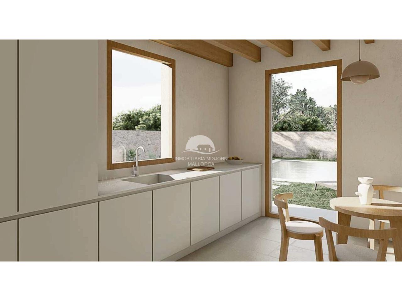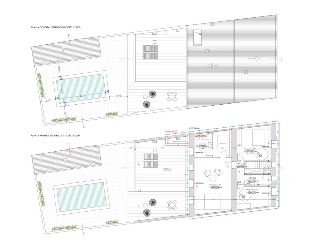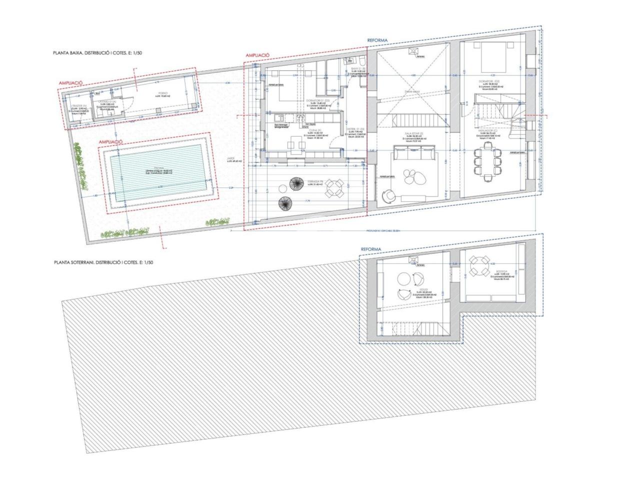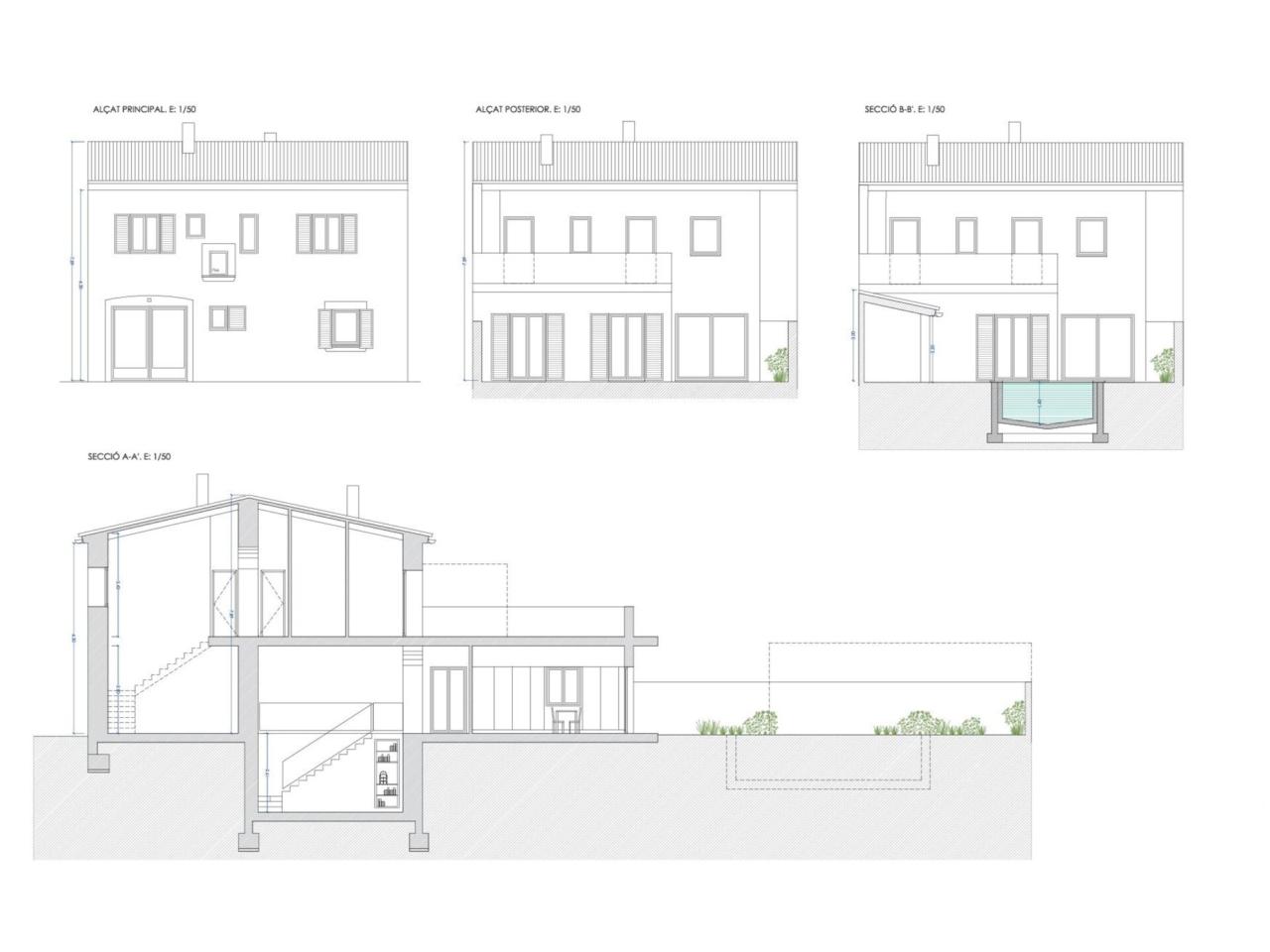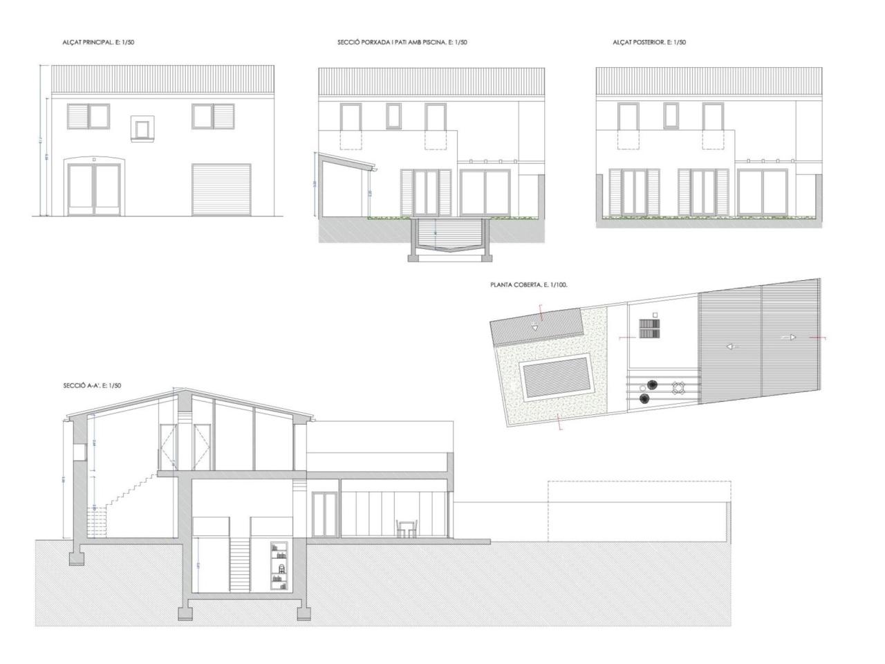 En la planta baja habrá un amplio salón-comedor, cocina separada y acceso a la pérgola del patio y al área de piscina. El proyecto prevee además un garaje, un dormitorio doble, un baño y un aseo de huéspedes en el anexo. En primera planta habrá tres dormitorios dobles con armarios empotrados y dos baños uno de los cuales en suite. También encontraremos una amplia la terraza solárium.